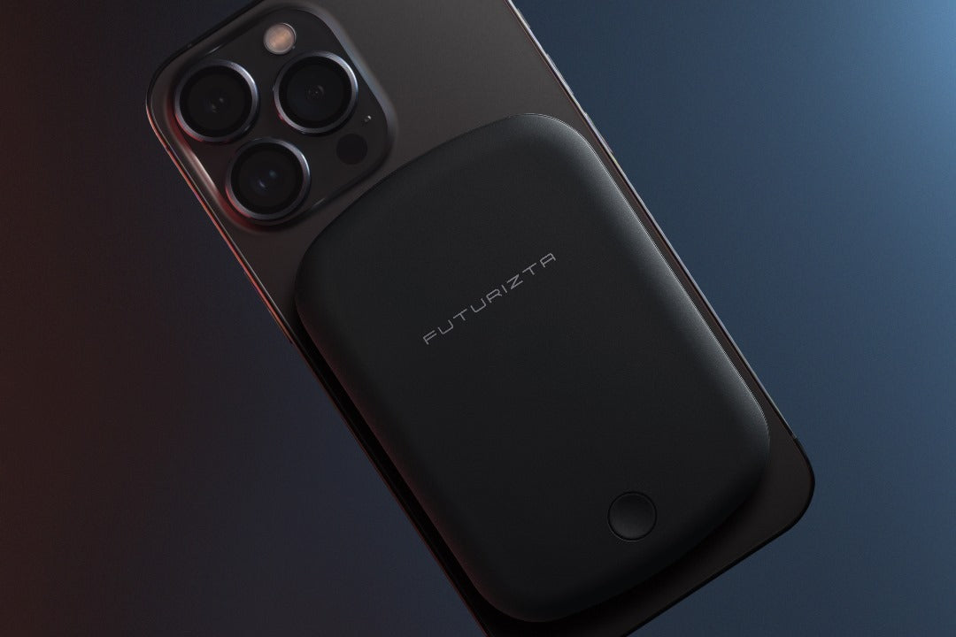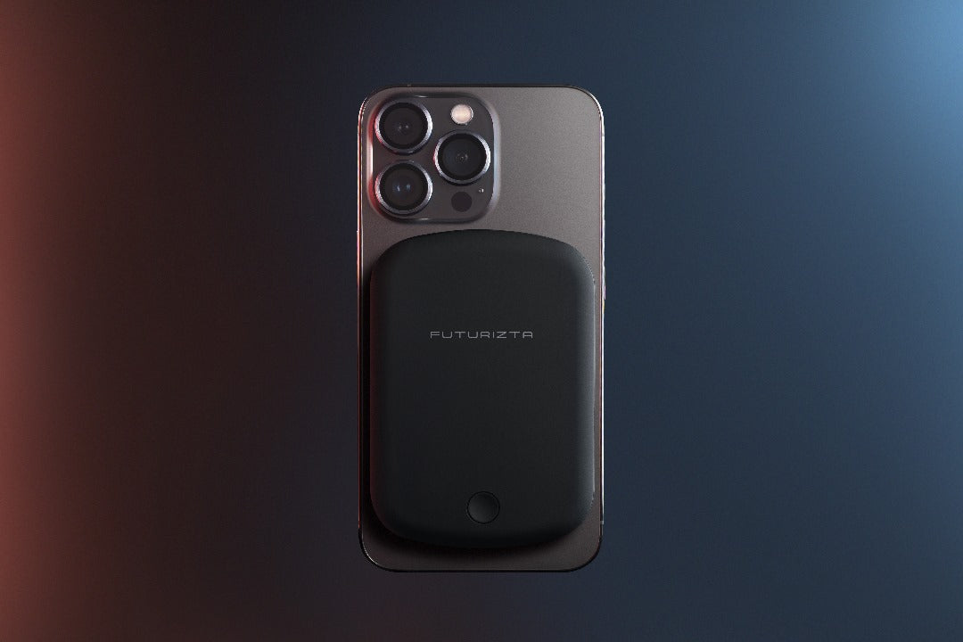 Pixy Go 5000mAh Thin MagSafe Wireless Power Bank attached on an iPhone 13