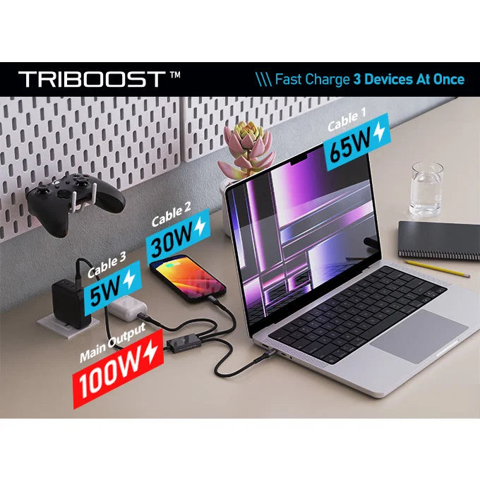 Triboost technology intelligently splits up to 100W of power across multiple devices ensuring all your devices receives optimal charging speeds.