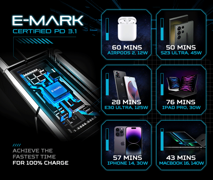 E-Mark Smartchip allows Zeus-X GO to reach max PD fast charging speeds with all compatible devices.